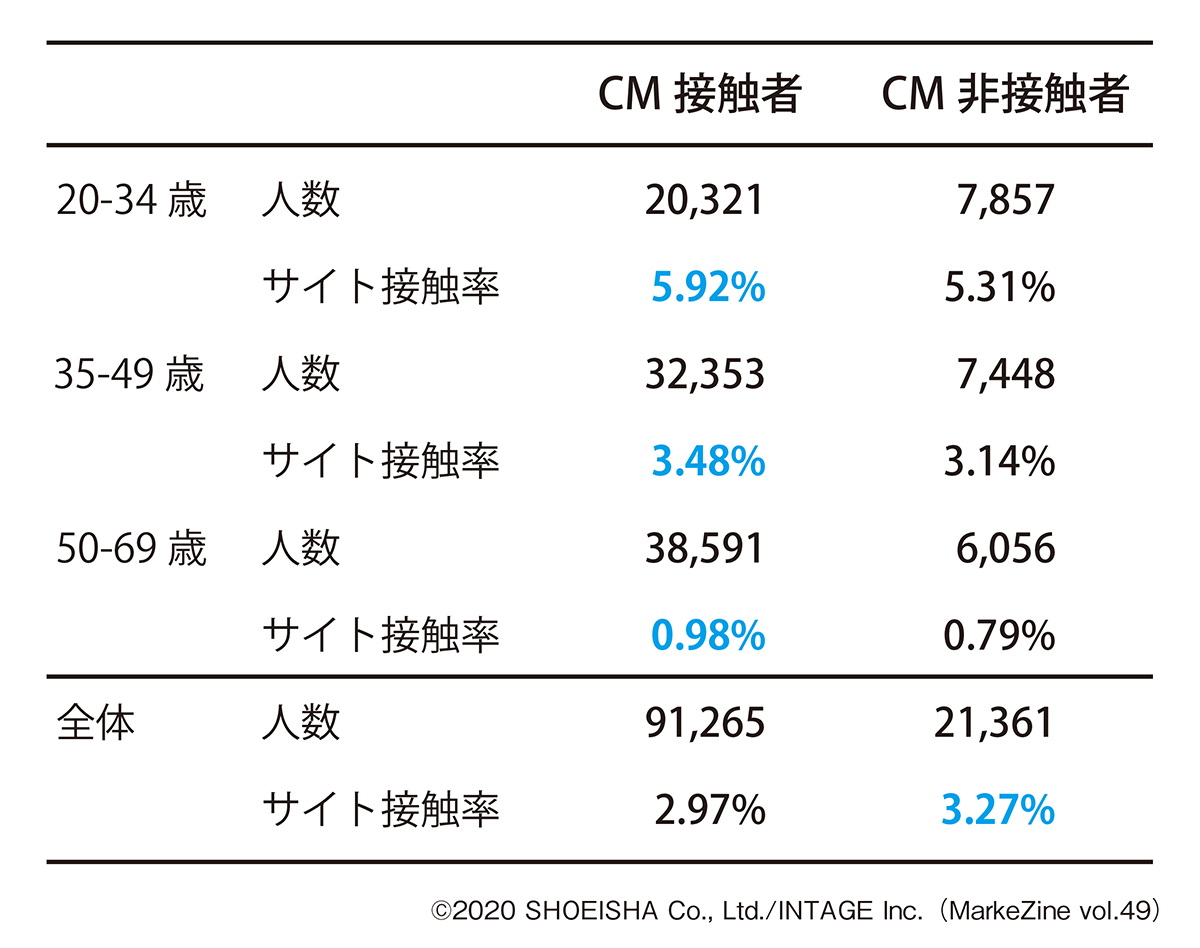 このときに、テレビCM接触者と非接触者で自社サイト接触率を単純集計し、比較をしてみたい(図表2)。