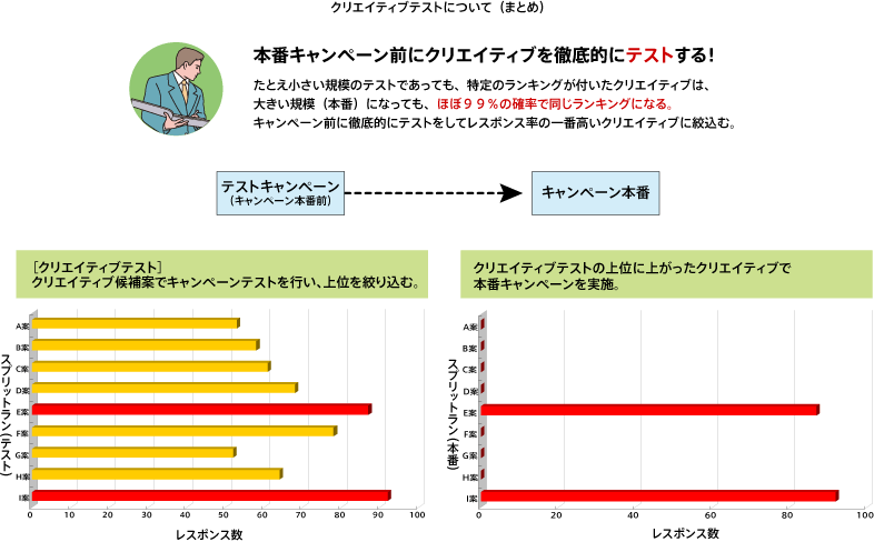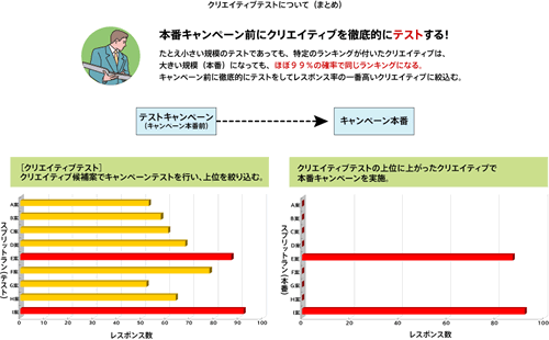 まず、キャンペーンの効果を最大化するのは、必ず事前にクリエイティブテストをして、レスポンスの一番高いクリエイティブに絞り込むべきである。