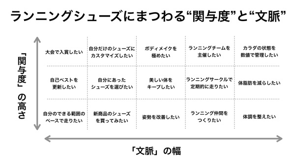 ファンの関与度と文脈について、ランニングシューズを提供するスポーツメーカーを例に考えてみたい。ランニングシューズという商品ひとつとっても、そこに付随するファンの関心は様々だ。シューズの商品そのものに関心があり、自分にあったスペックのシューズを選びたい人もいれば、ボディメイクに関心があり、ランニングも含めたトレーニングによって自身のボディメイクを極めていきたい人もいる。ランニングイベントなどを通して仲間と出会ったり一緒に走ったりすることに関心のある人もいるかもしれない。2つの軸を基にすれば、下図のように整理できるだろう。