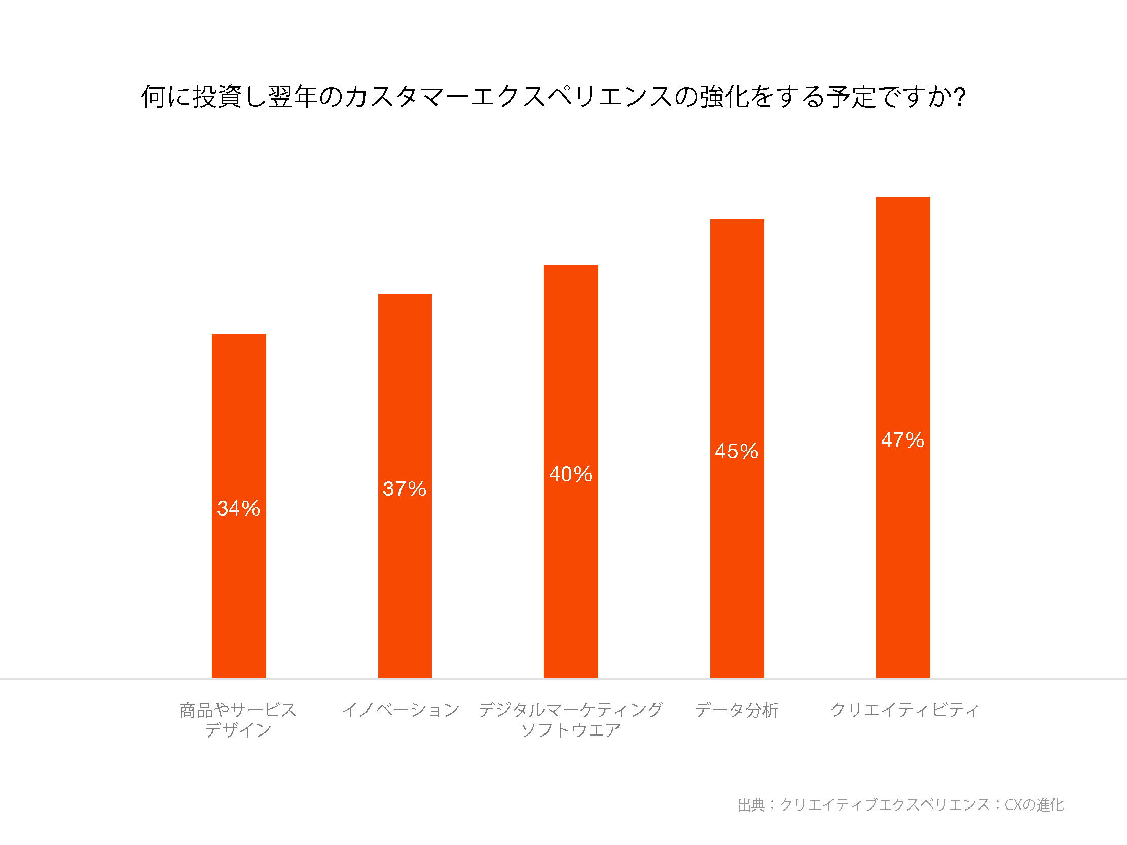 たとえば、今後何に投資するかという質問では「クリエイティビティ」が47%で1位、僅差で「データ分析」45%が続くので、両方を重視していく向きが強いと思います。