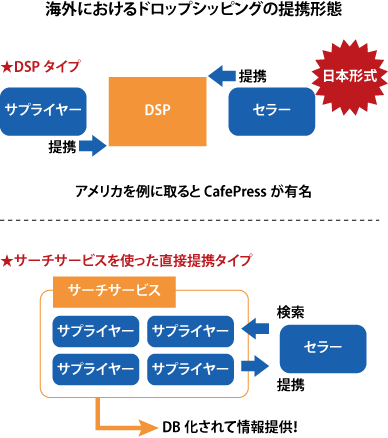 海外では、下記上図のような日本版DSの他にもサプライヤとセラー(ドロップシッパー)が直接提携を行い、協業していくというモデル(下記下図)が確立されており、サプライヤーのサーチサービスが活躍をしています。
