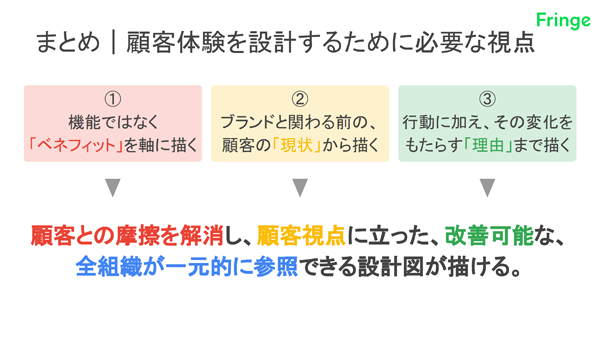 以上の通り、第2回では顧客起点での目標設定の概要と、顧客体験を描く上で必要な3つの視点を紹介した。3つの視点を満たす顧客体験は、顧客との摩擦を解消し、顧客視点に立つが故に効果的で、改善可能な設計図として機能する。