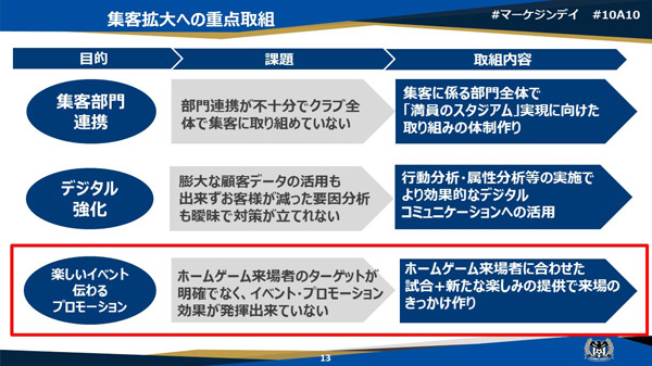 データを収集するようになり、「“チームが強いから観に行こう”ではなく、“楽しそうだから行ってみよう”というのが本質的なニーズなのではないかと気がついた」と竹井氏。そこで、”楽しそうだから行ってみよう”を前提に、意図と目的を持って企画するようにした。