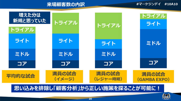 来場者全員に限定のオリジナルユニフォームを配る「GAMBA EXPO」では、新しい学びもあった。「ユニフォームがもらえるならお得と思って割とライトなお客様が来場すると思い込み、新規顧客を取り込むイベントと位置付けていた。だが、蓋を開けてみるとミドル、コアのファンが多かった」と竹井氏。「データを見て我々の思い込みが正された例」という。