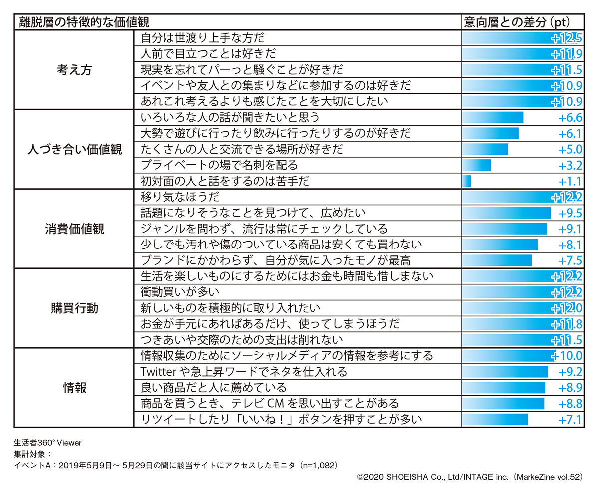 「現実を忘れてパーッと騒ぐことが好きだ」「イベントや友人との集まりなどに参加するのは好きだ」「大勢で遊びに行ったり飲みに行ったりするのが好きだ」など人付き合いに積極的で、賑わいのあるイベントや楽しい場所を求めているようだとわかります。消費価値観では「話題になりそうなことを見つけて、広めたい」「ジャンルを問わず、流行は常にチェックしている」というように流行りに敏感なことがわかります。
