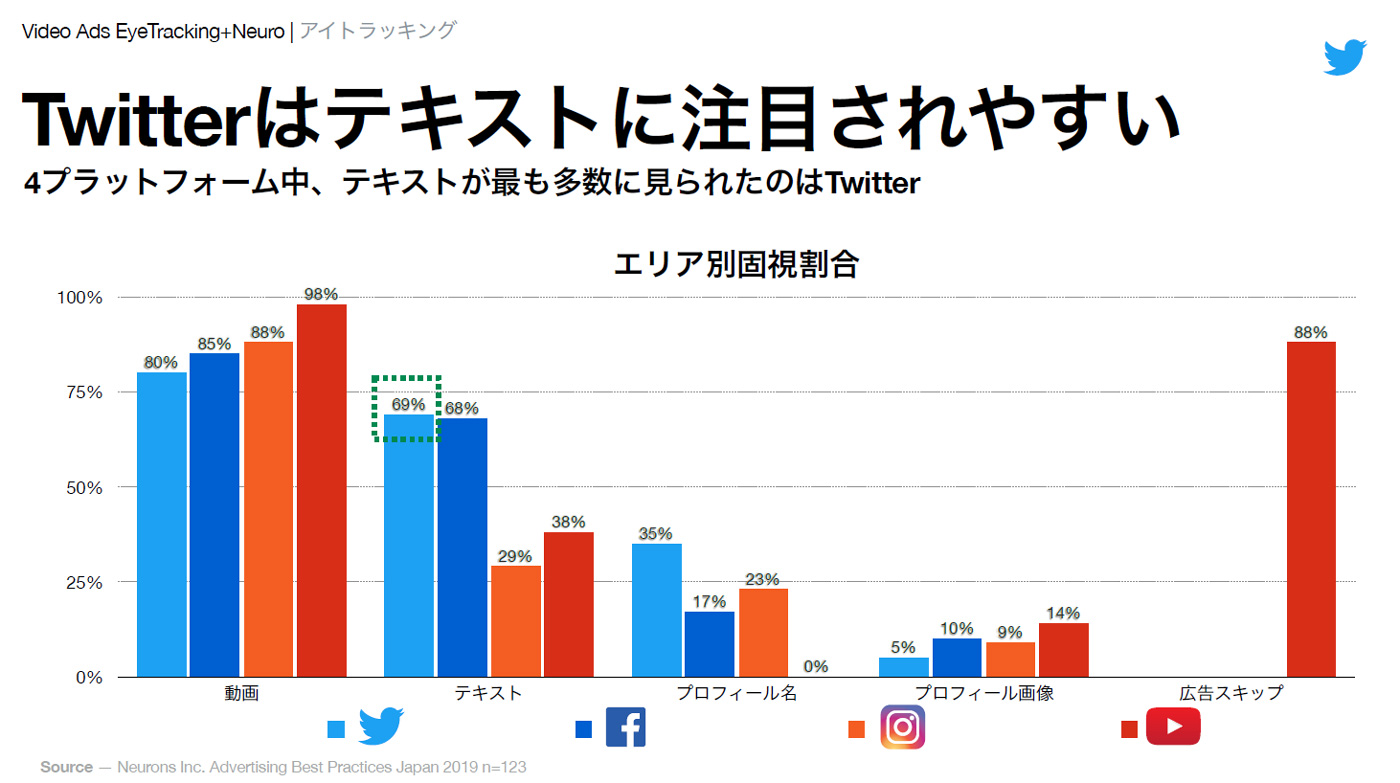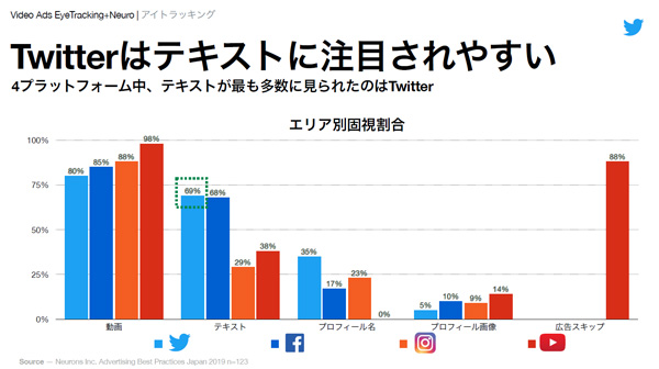一方で、「テキスト」のエリアは、プラットフォームごとに差が大きく現われた結果に。TwitterとFacebookの「テキスト」は7割近く見られている一方で、Instagramは29%、YouTubeは38%だった。またYouTubeのみだが、「広告スキップ」は88%が見ていた。