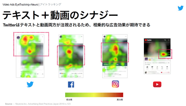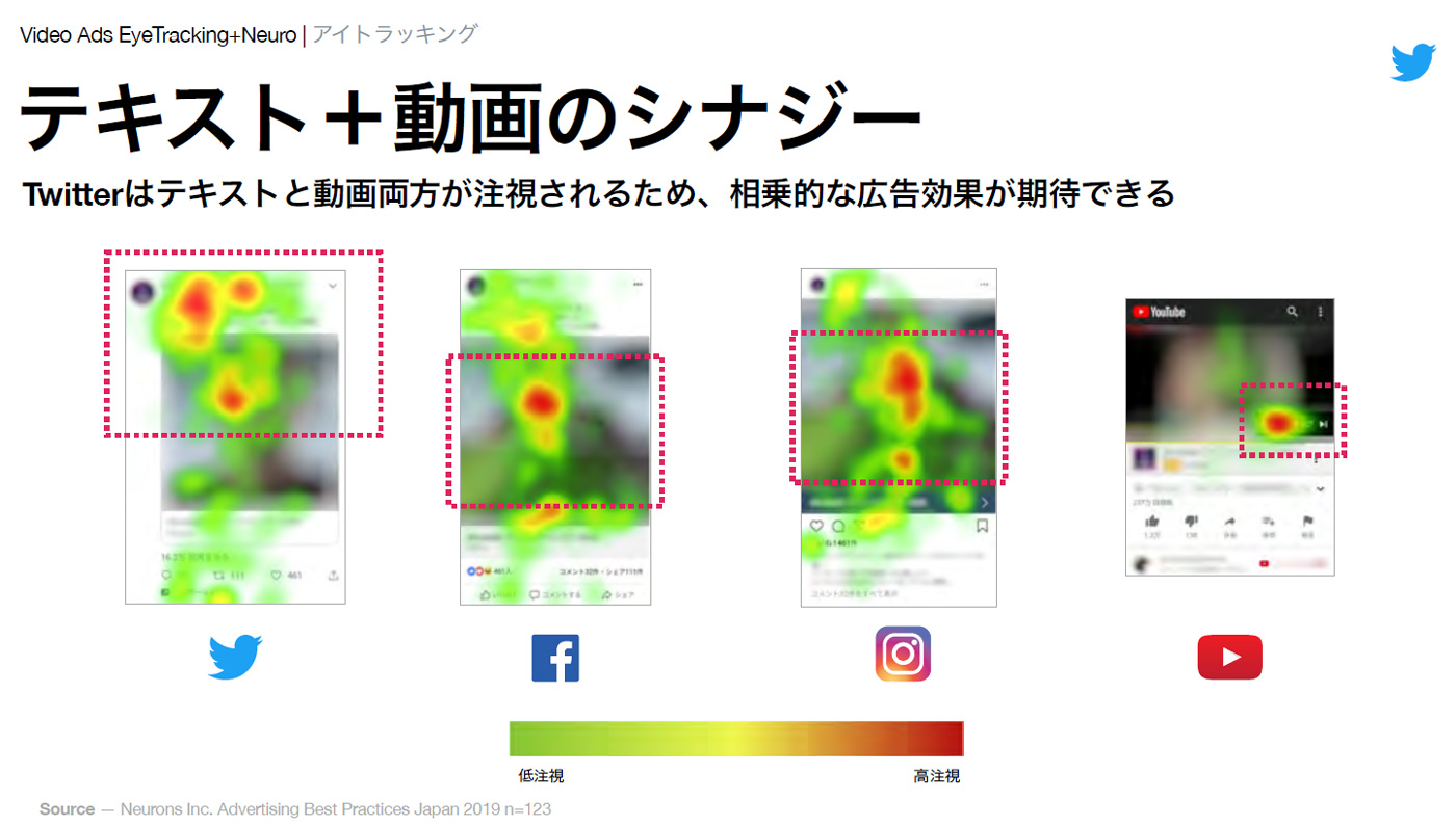 テキストの部分を見た人の割合に対しては、先程の図表でTwitterとFacebookはほぼ同じだったが、注視を表すヒートマップを見ると、Twitterが圧倒的に高いことがわかる。注視しているエリアを比較すると、Twitterに関しては「動画」だけでなく「テキスト」もよく見られている。Facebook、Instagramに関しては、注視されているのは「動画」が中心だ。
