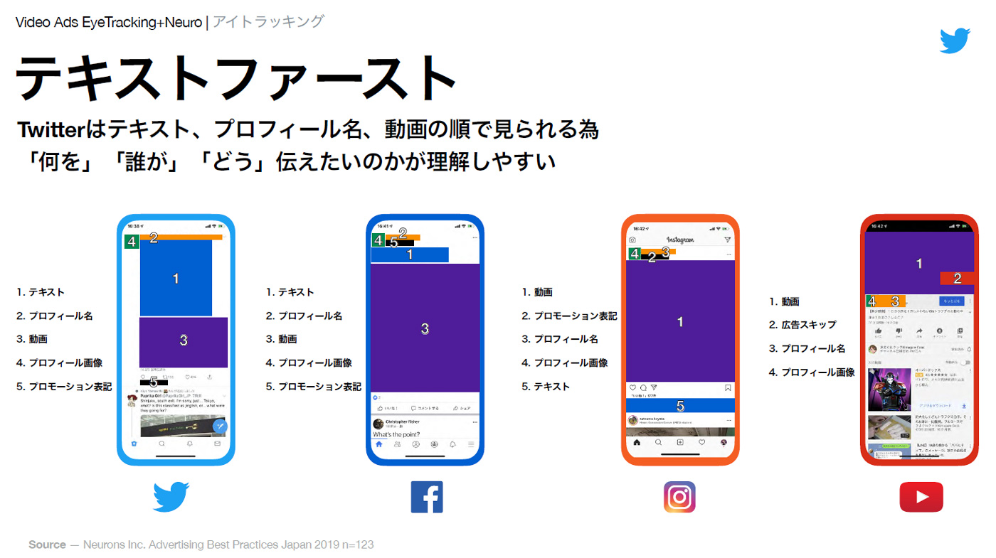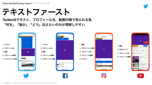 さらに、各プラットフォームでみた広告の中のエリアが、どのような順番でみられていたかの平均を算出。TwitterとFacebookは、テキストがまず見られる「テキストファースト」である一方で、InstagramとYouTubeは動画が最初に見られる「動画ファースト」だった。