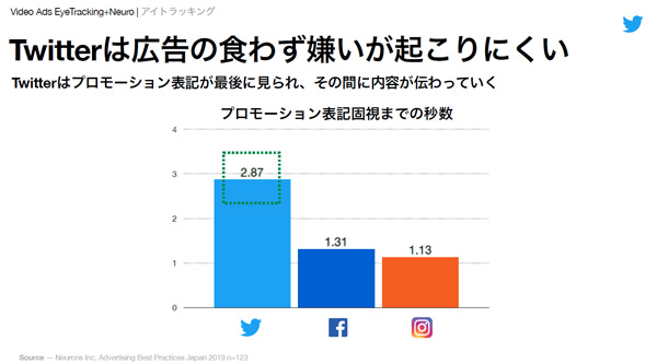 さらに、今回の動画のプロモーション表記を見る(動画を広告と判別する)までにかかった平均秒数を比較すると、Twitterは2.87秒と最も長い時間がかかったという。
