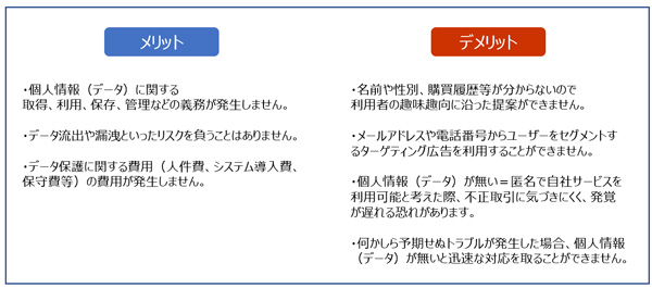 当たり前かもしれないですが、メリットよりもデメリットの影響度のほうが高いように感じます。また、そもそも個人情報(データ)を取得しない戦略を取れる企業は限られてくるように思います。名前や性別はもちろん、個人を識別する番号(マイナンバーや運転免許証番号等)、ターゲティング広告に利用するメールアドレスや電話番号、クレジットカード情報などはすべて個人情報(データ)と考えます。自社はもちろん、業務委託先企業で利用している場合にもデータ保護の義務が発生します
