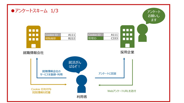 利用者は就職情報会社のサービスの登録・利用を通じて、就職情報会社から「Cookie ID」を付与され「閲覧情報」を就職情報会社に把握されています。採用企業からはWebアンケートのURLが送付され、アンケートに回答することで「Cookie ID」と「採用企業固有の管理ID」が付与されています。