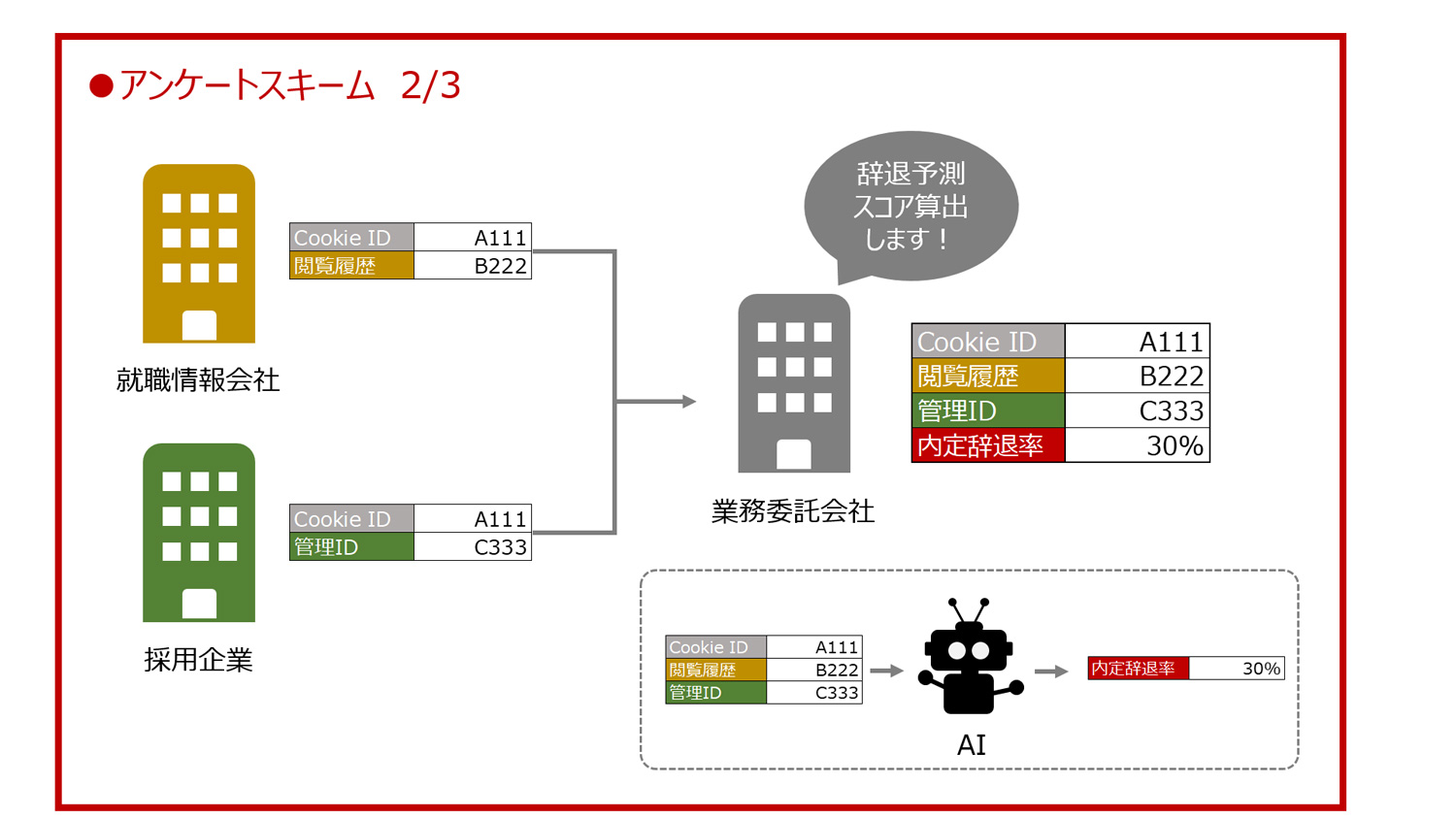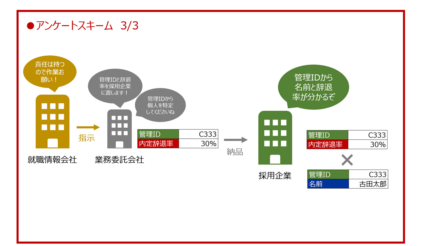 業務委託会社は「管理ID」と「内定辞退率」を採用企業に納品します。採用企業は「管理ID」から名前と内定辞退率を知ることができました。