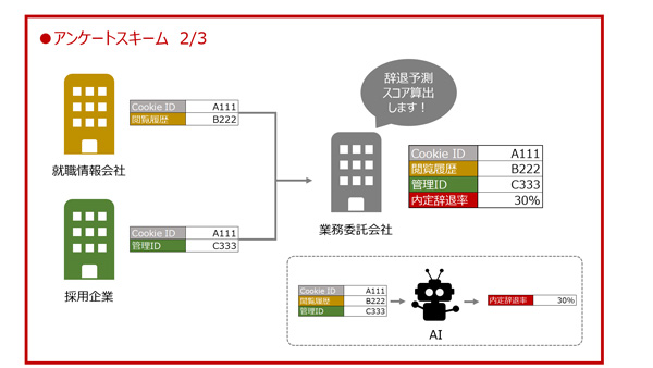 就職情報会社と採用企業が利用者に付与した「Cookie ID」と「閲覧履歴」、「管理ID」をもとに、委託会社は「内定辞退率」を予測します。