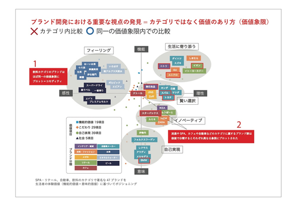 飲料カテゴリーに属するブランドは概ね同じような印象を持たれている一方で、自動車やカフェ、SPAや流通カテゴリーに属するブランドは、印象に差異が生まれている(異なる象限にプロットされる)ことが多いことに気づきます。
