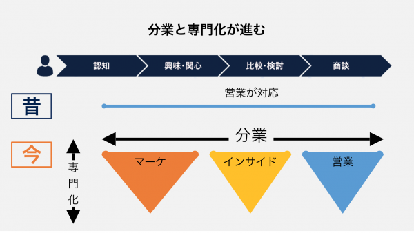 具体的には、マーケティング部門の人が製品やサービスを顧客に認知させるために活動し、営業の人がクロージングをする、最近では、インサイドセールスが引き上げ、ナーチャリングをして、フィールドセールスがクロージングをするという具合です。このように分業化が進むと同時に、それぞれのプロセスの専門性も高まっています。