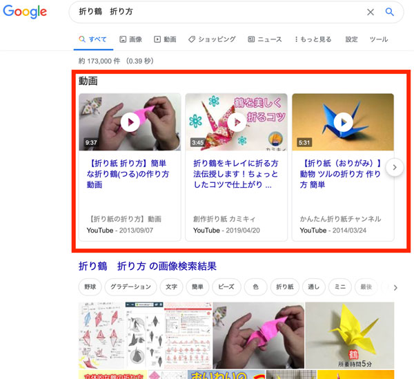 「折り鶴 折り方」で検索した時に、トップに表示されるのはテキストコンテンツではなく、動画だ。動きのある内容の場合、文字よりも動画のほうがわかりやすい。