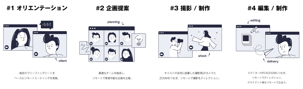 佐々木:オリエンから企画・提案、そのフィードバックや撮影、編集まですべてテレビ会議ツール「Zoom」で完結してしまう制作スタイルです。映像制作だけでなく、広告サービス全般のクリエイティブを網羅的に対応します。撮影に関しても、キャストの元に、グリーンバックやカメラ、照明、衣装を送付。ディレクションはZoomで行います。