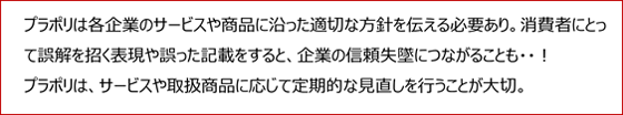 このプラポリの文言を検索してみたところ、いくつかの企業で全く同じプラポリが見つかりました。おそらく、制作会社が用意した雛形のプラポリをそのまま利用していると思われます。消費者には企業ごとのサービスや商品に沿った、適切な方針を伝える必要があります。誤った方針や誤解を招きかねない方針を伝えてしまうと、企業の信頼失墜につながりかねません。また、プラポリは企業のサービスや取扱商品に応じて定期的な見直しがオススメです。