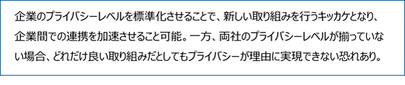 GoogleやAppleと言われると、なかなか自分ごと化しにくいように思えますが、自社のプライバシーを標準化することで、プライバシーレベルを揃えることでき、企業間の連携をスムーズに行うことができると感じます。連携したい企業同士のプライバシーレベルが揃っていない場合、どれだけ良い取り組みがあったとしても実現できない恐れもあります。