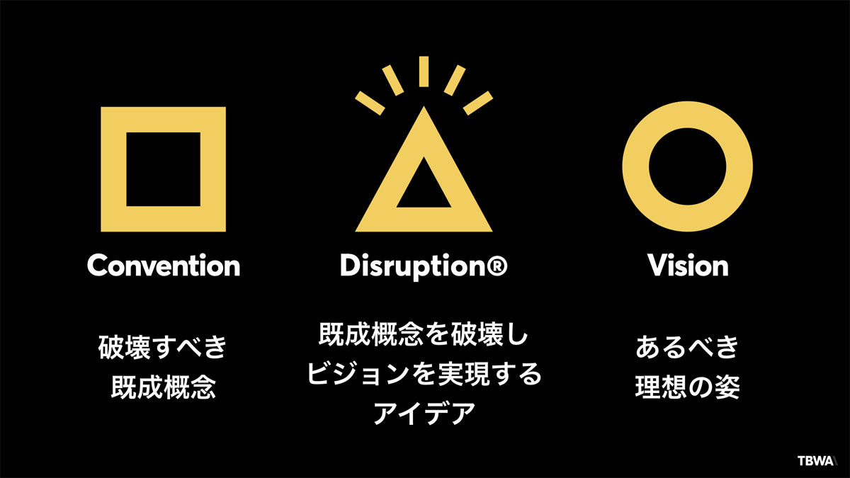 Disruptionは、「1、Convention(コンベンション)=既存の市場やプレーヤーを見渡し”破壊すべき既成概念”を発見する」「2、Vision(ビジョン)=既成概念を破壊した先の“あるべき理想の姿”を明確化する」「3、Disruption=既成概念を破壊し“ビジョンを実現するアイデア”を開発する」という大きく3つのステップから成り立ちます。