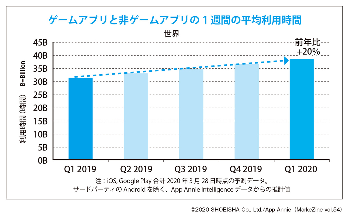 2020年第1四半期(1月〜3月)のアプリ利用時間は、2019年同期比で20%増加。1日あたり3時間40分が平均であるため、今のペースが続くと4時間を超える可処分時間がモバイルに投じられることになる。