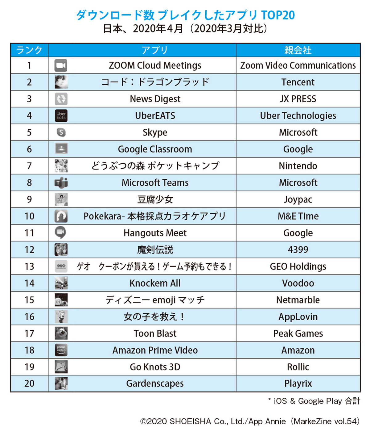 図表4は、2020年3月と比較した際に4月でダウンロード数を多く獲得したアプリTOP20だ。