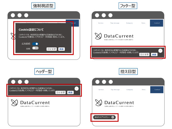 最後にご紹介する「控え目型」はDataSignが開発した国内産CMPです。「3. 地域別の表示内容の出し分けと言語設定」でご紹介した同意設定の通り、日本では個人情報の取り扱いの際、原則として同意を求められていないことから、標準で「ON(同意する)」とすることができます。デザイン面においても、あえて控え目な表現としており、CMP導入の際に課題となりがちな同意率の低下を回避できるのではと期待されています。
