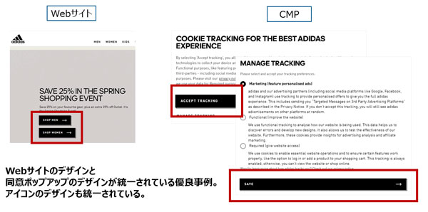 同意ポップアップとWebサイト全体のデザインが大きく異なってしまうと、訪問者に違和感を与えてしまい、同意率の低下と不信感につながります。文字のフォント、大きさ、背景色、前景色、アイコンデザインが、自社サイトのデザインに酷似することができるのかについて確認が必要です。