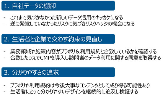 生活者の意識は急速に変化している中で、いくら良いサービスや商品であったとしても、約束事が不明確な企業で買い物するのは怖いから避けよう……という風潮になってきたのではと感じます。今回ご紹介したCMPにおいても、プライバシーポリシーと利用規約が適切であるということを前提としています。いくら時間と費用をかけてCMPを導入したとしても、プラポリと利用規約が正しくなければ、CMPによる同意は意味のないものになってしまいます。