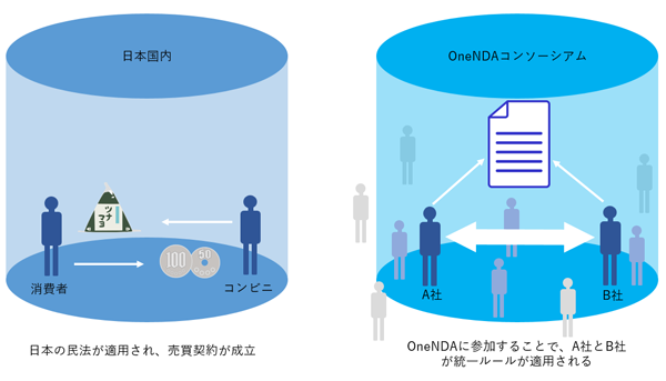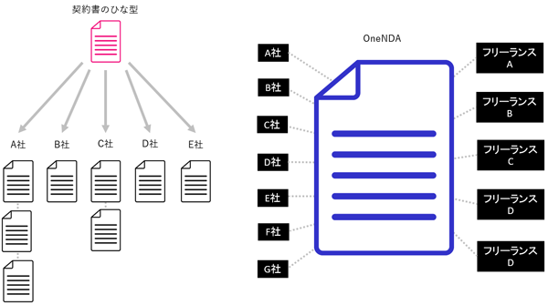 このイメージについて身近な例で言うと、Amazonを最初に使うとき、利用規約に同意しますよね。あれでAmazonと自分たちの間で契約の効力が発生している。それとかなり近い発想です。この場合は「利用規約に同意する」というかたちで契約が拘束力を及ぼすようになっています。OneNDAでも、その統一ルールに同意すれば、もうその後はそのルールがずっと適用されている状態になります。