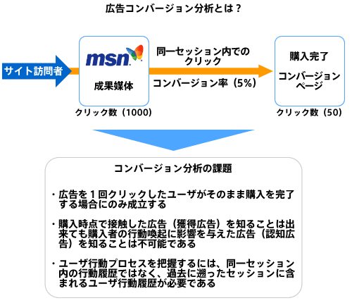 コンバージョン分析で、ユーザの行動プロセスが分からない最大の理由は、そもそもコンバージョン分析が、同一セッション内におけるユーザ行動を前提とした分析データを基準としている点にあります。広告反応を例に見た場合、コンバージョン分析では、購入時点で接触した広告(獲得広告)を知ることは出来ても、購入者の行動喚起に影響を与えた広告(認知広告)を知ることは不可能です。