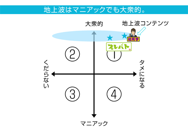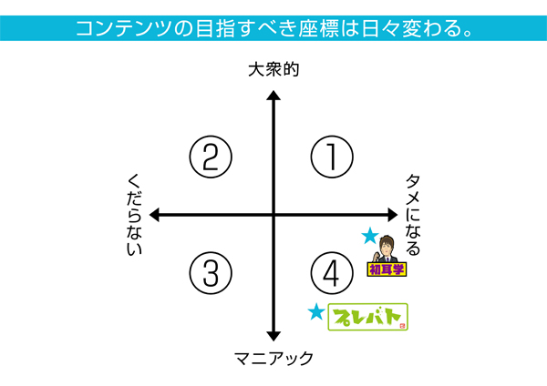水野:ありますよ。この「情」と「報」をもうちょっと広げて考えています。横軸に「情」と「報」を言い換えて、「情報性のない(いい意味でくだらない)/タメになる」と置きます。そして、縦軸に「大衆的/マニアック」と置いて、4象限のマトリクスを描き、番組をどこにポジショニングするかを意識しています。