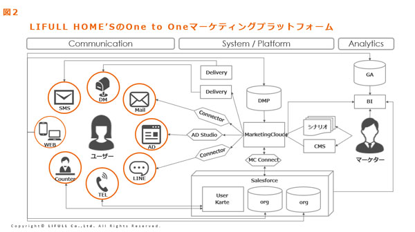 MAはDMPをもとに、ユーザーの興味関心に沿ったコンテンツをメールやチャットでタイミング良く出し分けることがモットーとされる。「いつ/誰に/何を/どのように」というシナリオをマーケターが設計し、MAが自動実行するという手順だ。下図は実際のLIFULL HOME’SのMAプラットフォームである。