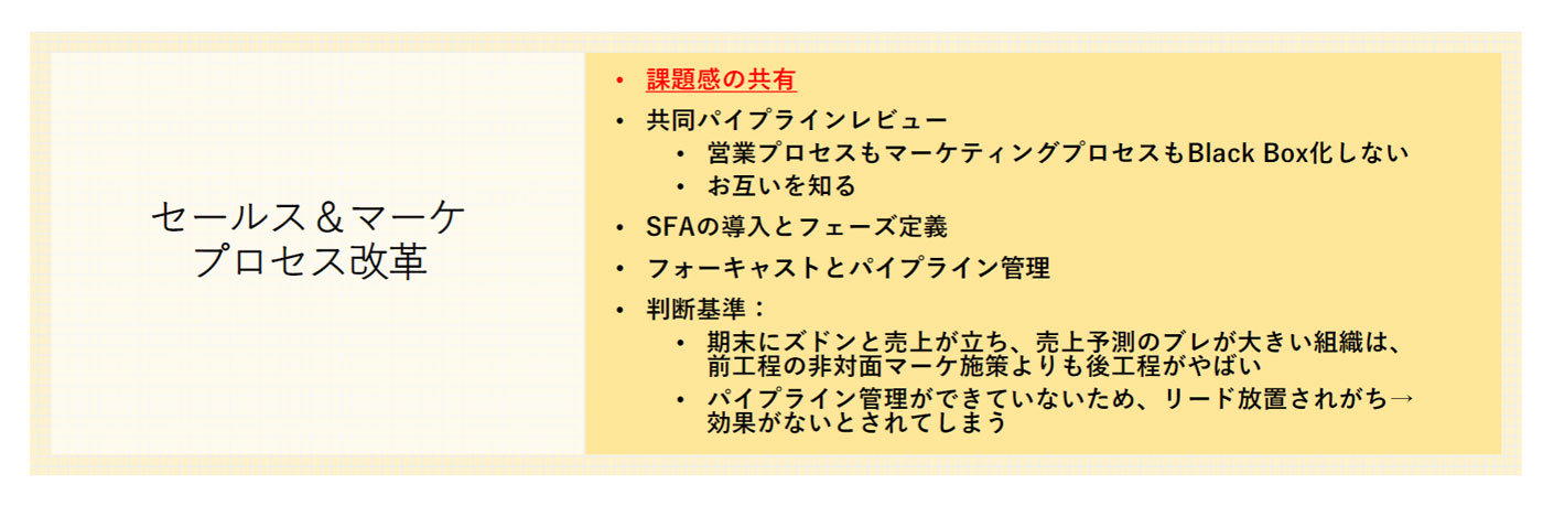 その方法には、共同のパイプラインレビューが効果的だ。前提として、SFAを導入した、案件管理やフォーキャスト、パイプライン管理は必須である。ここで注意したいのは、期末だけ大きく売上が増えるなど、売上予測のブレが大きい組織。パイプライン管理の見直しから始めたい。