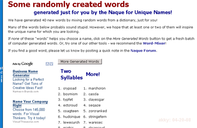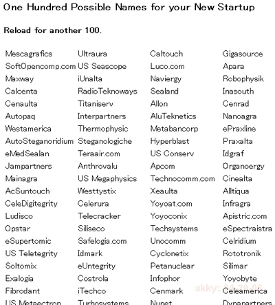 また、ネットサービスの場合は、正しい英語でドメイン名が取れない(辞書にあるような単語は使わなくても先行した業者が押さえてしまっている)ことが多く、辞書とちょっとだけ違う単語を考えたり二語以上の単語をつなげたりという努力が多数行なわれています。Company Names(会社名)では、ページをリロードするたびに、ネット風な社名を100個生成してくれます。