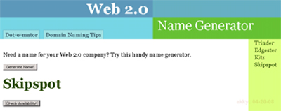 Web2.0的なサービスには、ドメイン名の衝突を避けて変な名前のものも多いですが、このジェネレータはそれを揶揄しているところも多少あるかもしれません。Web2.0 Company Name Generatorでは、そんな「Web2.0っぽい」名前を提案してくれます。
