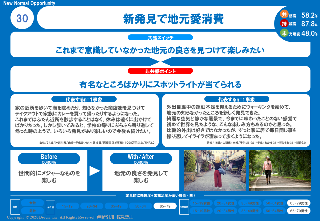 「これまで意識していなかった地元の良さを見つけて楽しみたい」という欲求が強まる中、みなさんのビジネスでこの欲求を充たすことができるとしたら、何ができるでしょうか。そのように発想してみてください。