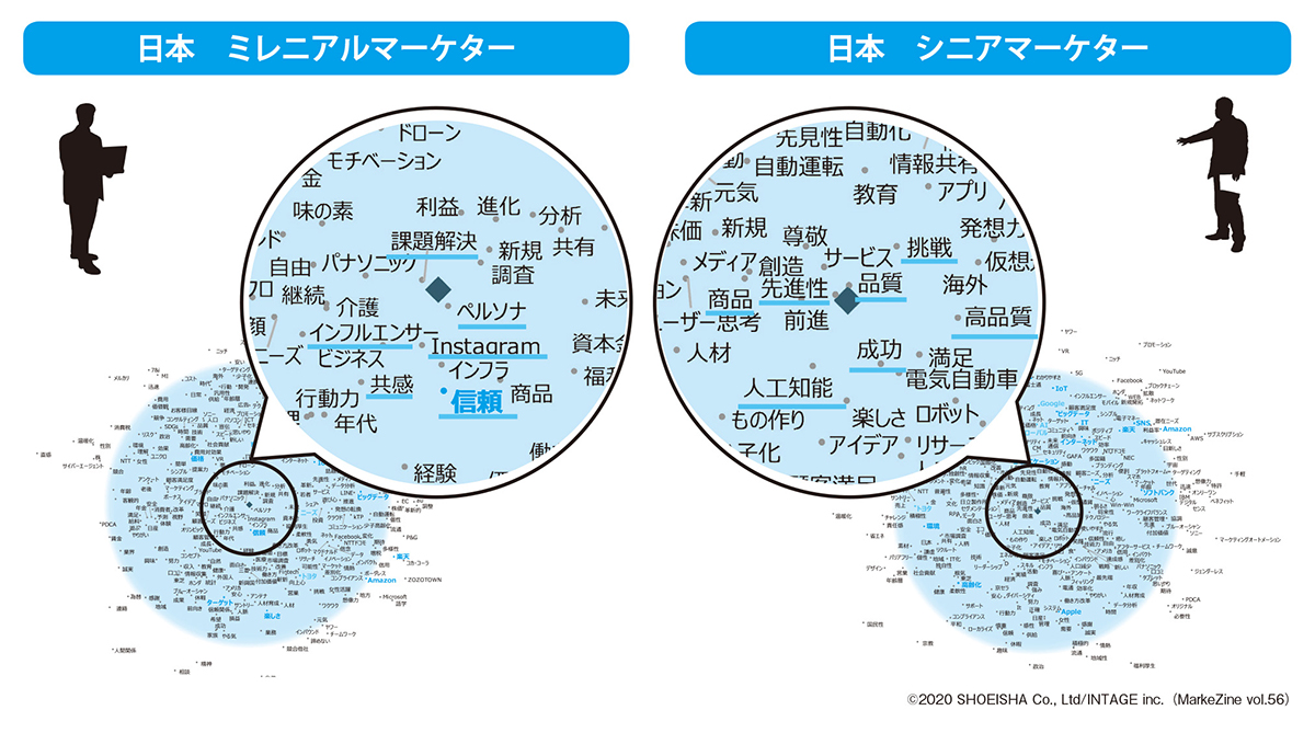 杉野:日本のマーケターにとって、近未来の「戦略」とは何を意味するのでしょう。図表2を見ると、ミレニアルマーケターでは、「戦略」は、北東にあり、周辺には「シーズ」「顧客」「市場」「グローバル」「先進的」「トレンド」「最先端」があり、市場を開拓していく意味合いのエリアにあります。また、最も多い連想ワードだった「AI」もこのエリアに出現しており、IoTや最先端技術を駆使し、グローバル展開を狙い、顧客獲得、市場戦略を緻密に行っていきたい期待が表れています。