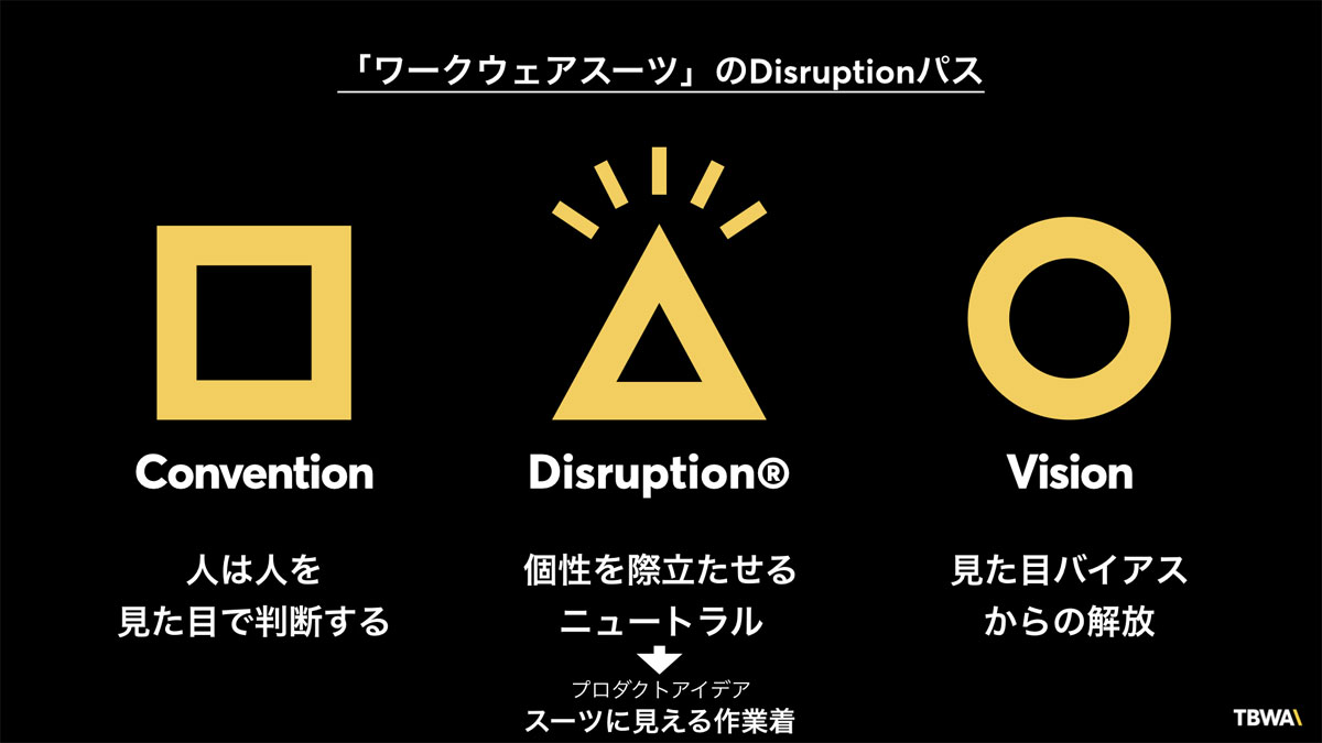 今回のスーツに見える作業着を仮に「作業着」というカテゴリーで捉えた時に敵となる破壊すべき既成概念(Convention)は「作業着は作業の時に着るもの」、あるべき理想の姿(Vision)は「いつでもどこでも着ることができる作業着」、既成概念を破壊しビジョンを実現するアイデア(Disruption)を「スーツに見える作業着」と捉えることもできたでしょう。