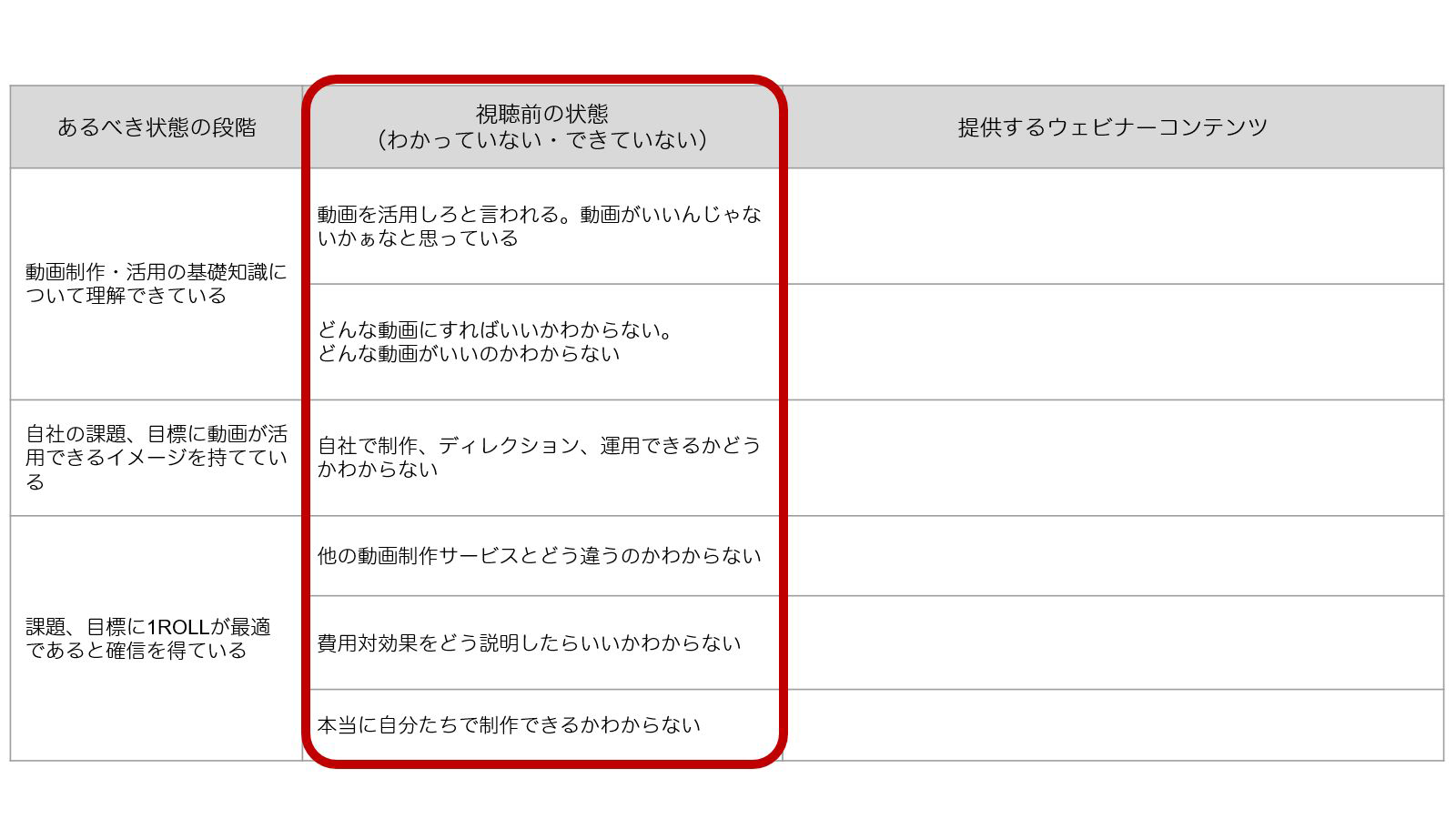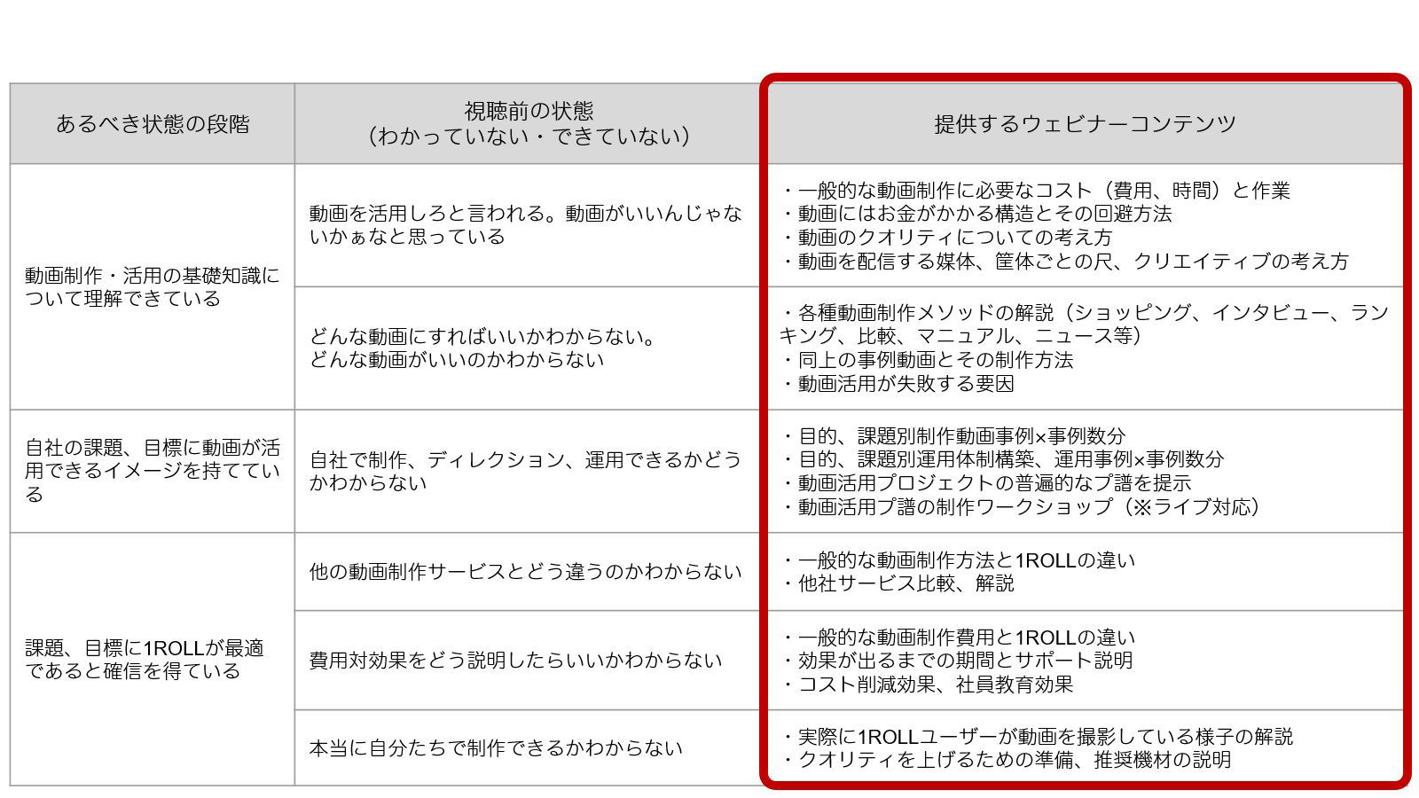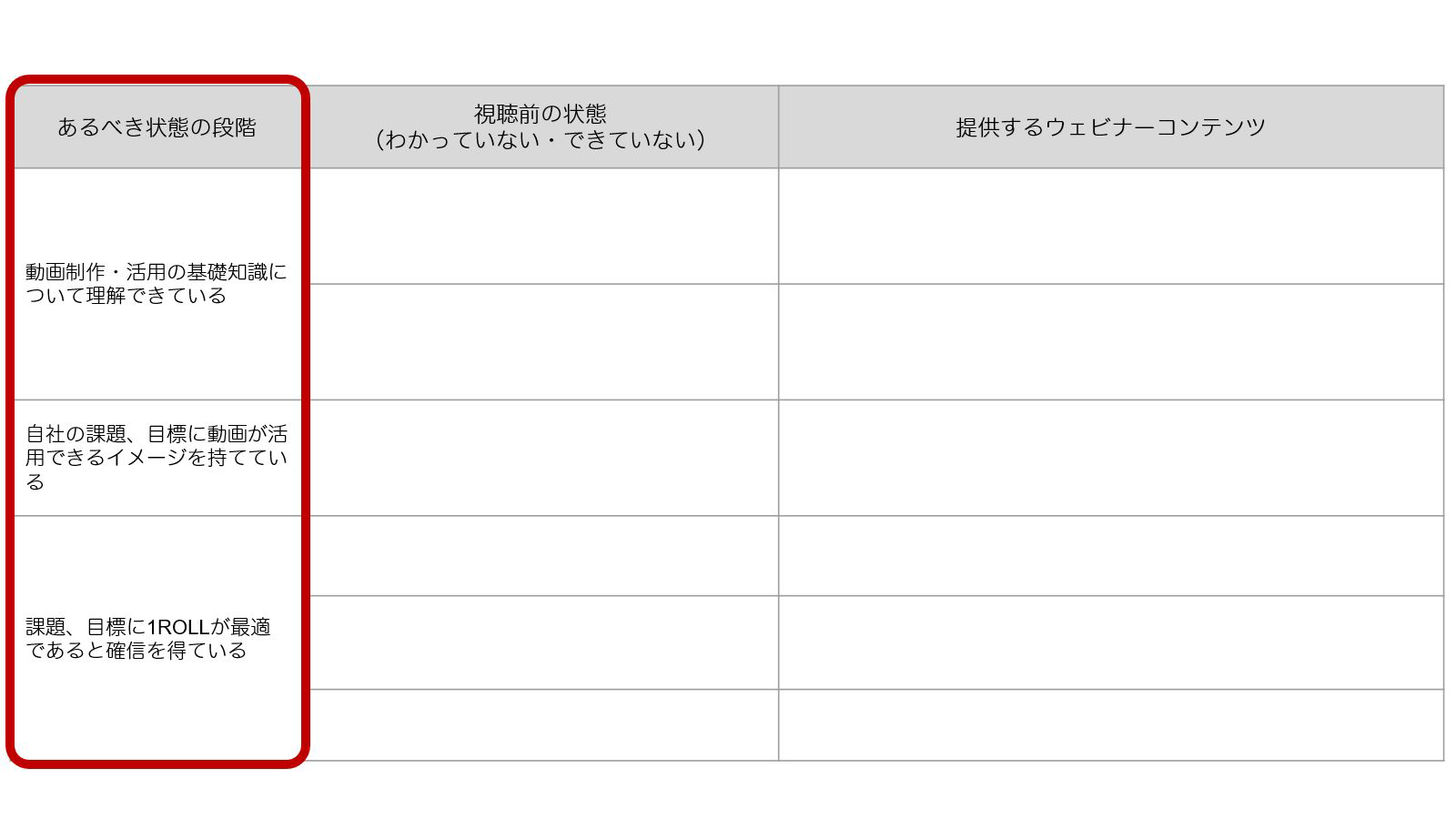 一番上の「動画制作・活用の基礎知識について理解できている」では、自社製品が属するソリューション上のカテゴリーや、見込み客の実現したい目標や解決したい課題などから考えます。次の段階「自社の課題、目標に動画が活用できるイメージを持てている」では、たとえばECサイトのCVR向上が見込み客の取り組むテーマの場合、その手段は動画である必要はなく、チャットボットなど他のソリューションでも良いかもしれません。そうした目標実現のためのソリューションが複数ある場合、見込み客に自社製品の属するソリューションが最も相応しいと感じてもらう必要があります。最後のあるべき状態は、ウェビナーコンテンツを提供する最終的な目標は自社製品の導入のため、「課題、目標に1ROLLが最適であると確信を得ている」としました。