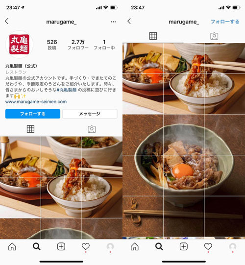 公式アカウントの投稿は、月数回程度。インスタはデジタル上のメニューであると捉え、検索で見に来てくれた方の受け皿と位置付けました。丸亀製麺のフィードを上から眺めていくと、うどんへのこだわりを伝える「ハイライト」がまず目に入り、その後、季節のフェア商品をモザイクアートのように9分割で表示させて印象づけます。