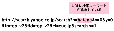 例として、Yahoo! Japanでの検索結果ページのURLを見ながら説明していきましょう。これは「hatena」というキーワードで検索したときの検索結果のURLです。そのため、URLの中に「hatena」という文字が入っているのがわかります。
