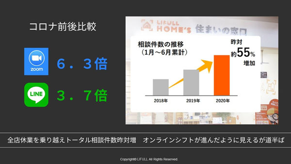 コロナ前後で比較すると、ZoomやLINEのオンライン相談は増えていますが、やはり店舗ニーズは強く、6月以降店舗が再開すると、まだ対面相談のほうが多い状態ではあります。ただ、このオンライン相談も一度体験してもらうと、非常に高い満足度が得られているんです。コロナの感染リスクも抑えられますし、今後も試行錯誤しながら推進していきたいところですね。