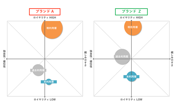 ブランドAは現利用層のブランドロイヤリティがその高さをけん引しています(ロイヤリティが高くボリュームが大きい)。一方、ブランドZはブランドAに比べて現利用層のボリュームこそ小さいですが、過去利用層のブランドロイヤリティが相対的に高くなっています。それが市場におけるブランドロイヤリティの高さを担保している要因と言えます。