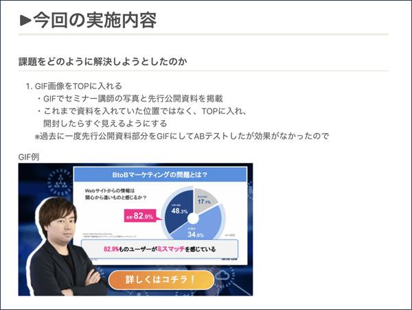 上記で挙げた画像は社内のあるマーケターの発表内容例ですが、登壇するのはマーケターだけではありません。このナレッジ共有会では、CSメンバーも各自の知見を発表します。