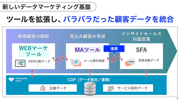 マーケティング基盤の再構築については、データ連携の課題を解決した。それまでもMAは使っていたものの、SFA(営業支援システム)とほとんど連携していないという弱点があった。そのため、顧客理解ができないままに、自社のタイミングで自社が知らせたいことを伝えるという、非効率的なアプローチとなっていた。