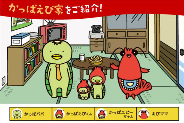 「かっぱえび家」は、“やめられないとまらない“でおなじみの、カルビー「かっぱえびせん」のキャラクターです。同社では、商品のパッケージデザインに用いるほか、子どもやファンに対するコミュニケーション手法として、TwitterなどのSNSを活用し、かっぱえび家の世界観を発信。かっぱえびせんのブランドメッセージを伝える代弁者として活用しています。