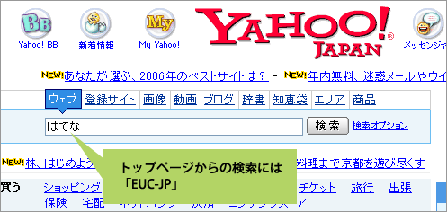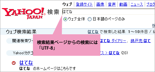 例えばYahoo!では、最初にトップページから検索を行った場合は「EUC-JP」という文字コードが利用されますが、検索結果ページにある検索窓から検索を行った場合は「UTF-8」になります。