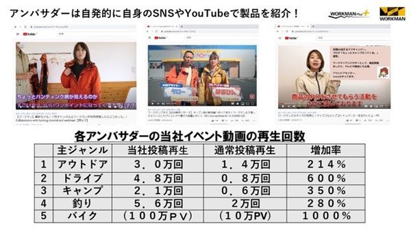 林:アンバサダーの方の伸びに関しては、「ワークマン製品を扱った投稿と、通常の投稿の差」を見ています。視聴が伸びていれば、ワークマンを使っていただくことでSNSの影響力が伸びているぞ、と考えています。逆に落ちてきたらうちの製品が飽きられているということですね。