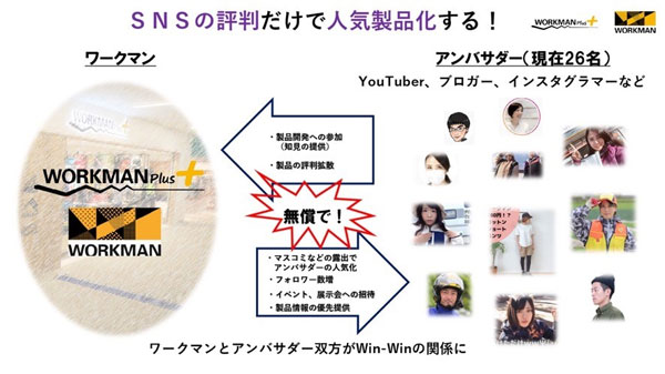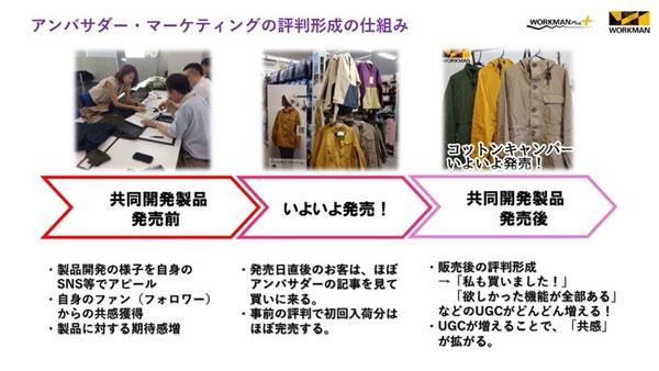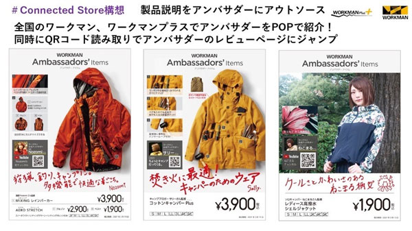 アンバサダーとコラボ開発した商品については、このようなPOPを店頭に立てますが、QRコードがあり、詳しい紹介はアンバサダーのYouTube動画やブログで見られるようにしています。ワークマンは全国に880店舗がありますから、もしも1店舗1日1人のお客様がQRを取ったとしても、毎日の積み重ねではかなりの量になるはずです。